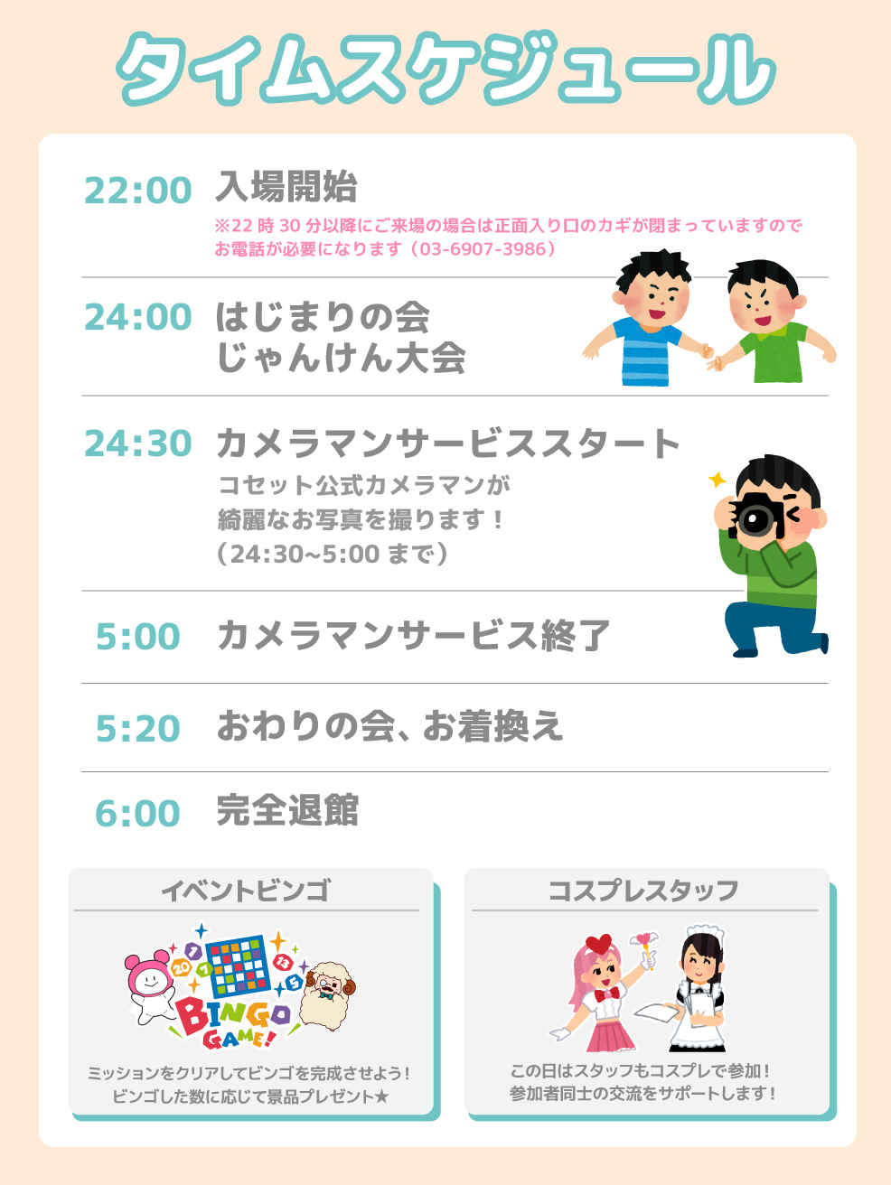 (チケットのご購入をstacaもしくはお名前で確認いたします。) - オールナイト開催は22時30分までは入退館は自由となりますが